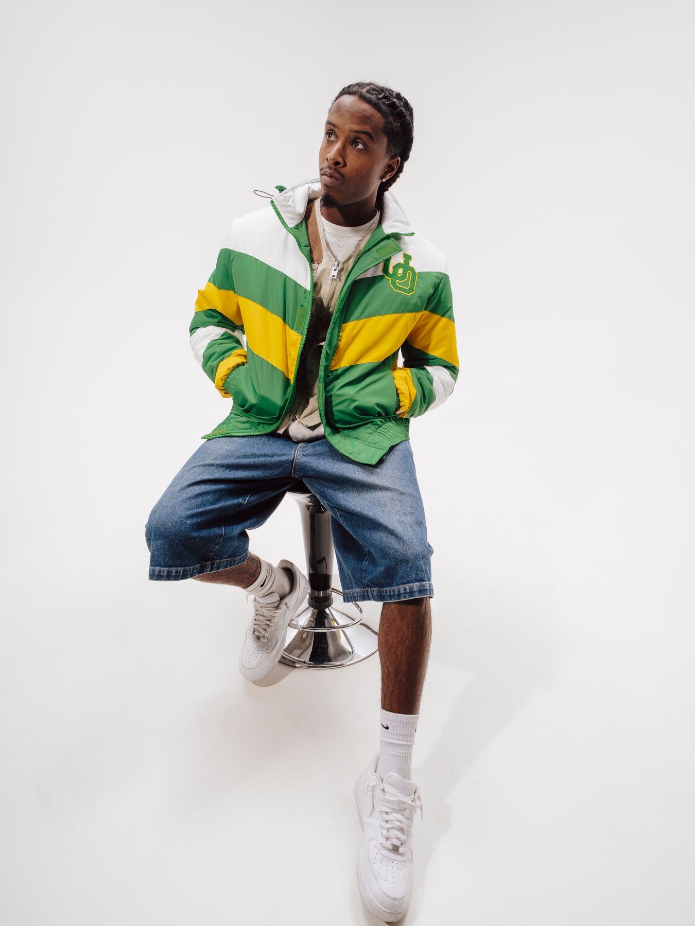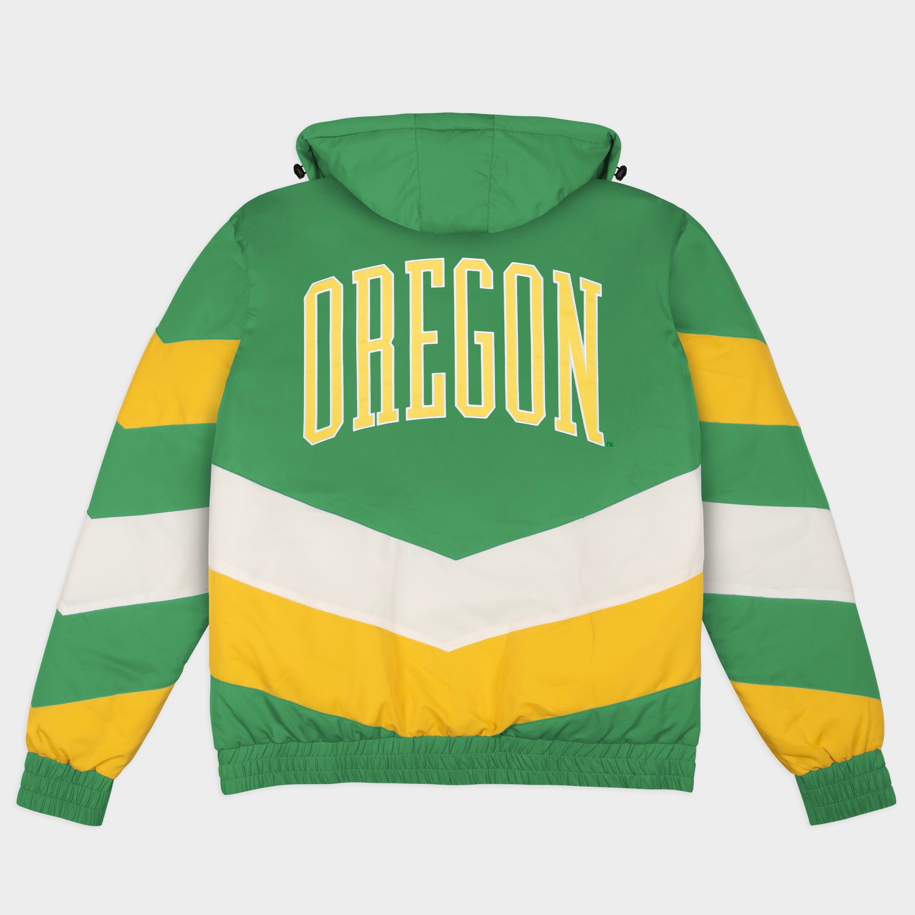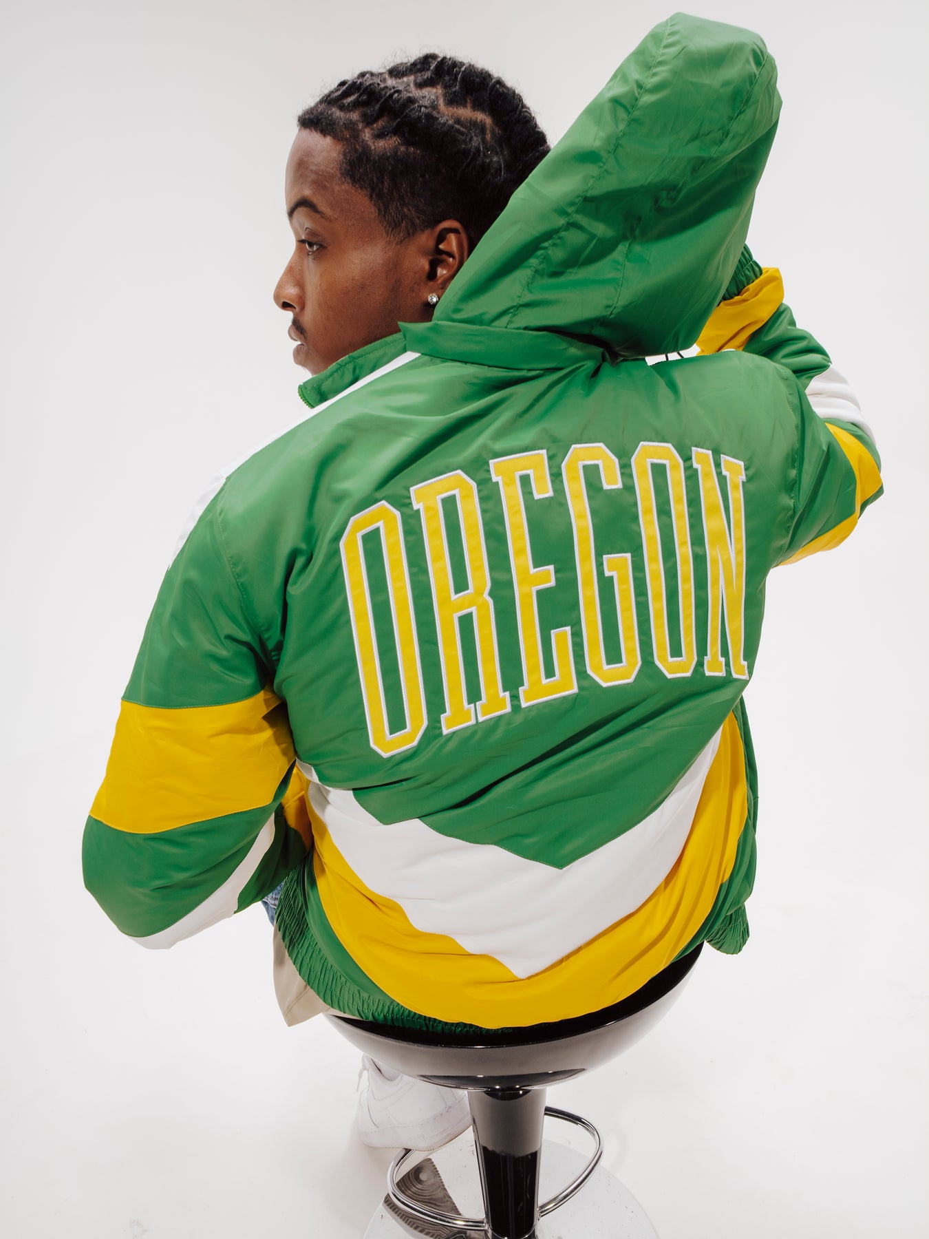 Change the winter jacket game with the Oregon Gamebreaker Jacket. Inspired by the bold, maximal sportstyle jackets of the 1990s, each jacket is designed with a high neck and removable hood to withstand whatever elements the day throws at you. The chevron stripes and classic, vintage logos on the chest and back paint the quintessential game day fashion picture.