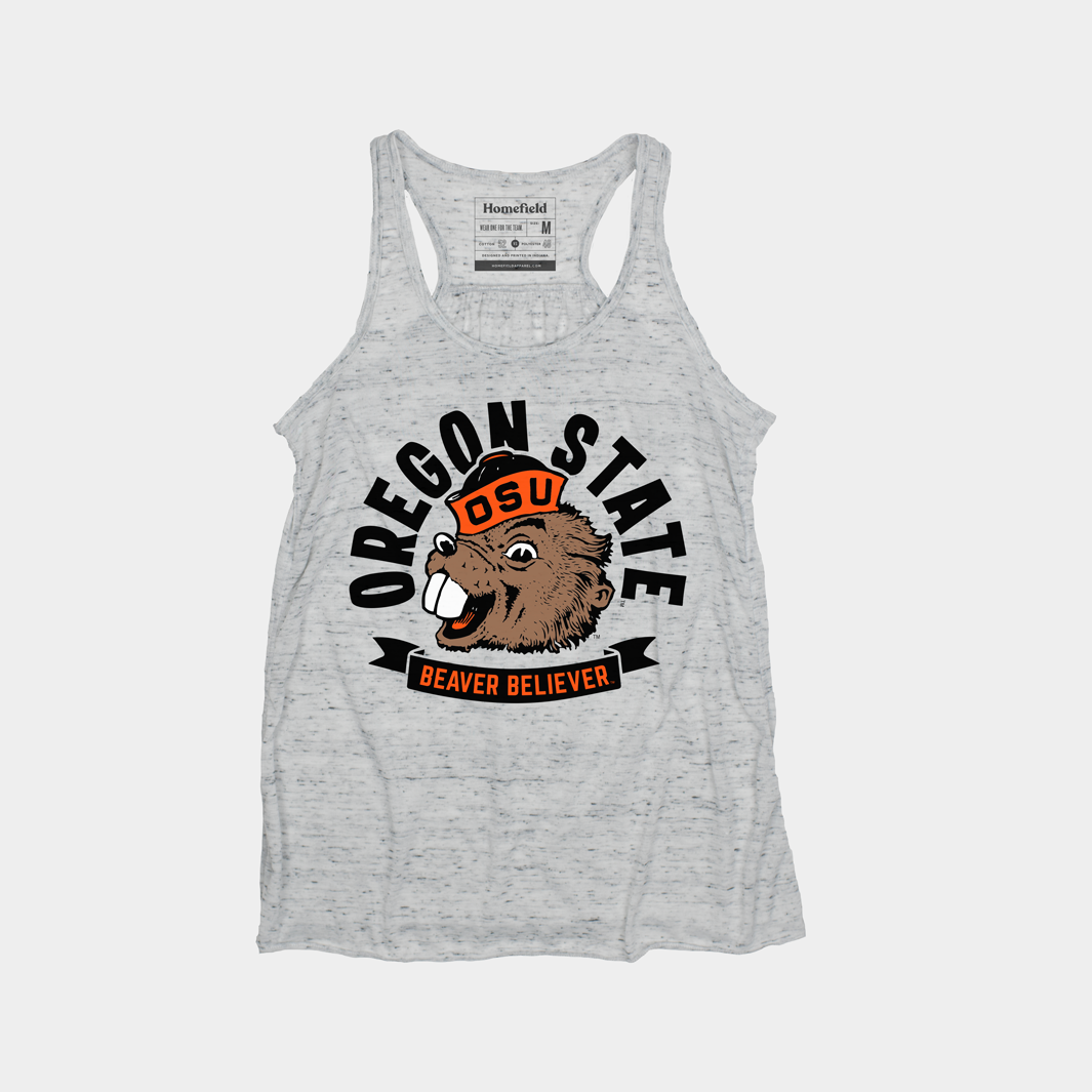 The story goes that OSU students tried to introduce a live beaver mascot named Bevo in 1921, but it wasn't until 1952 that Benny Beaver was adopted as the official mascot for Oregon State. Today, you can proudly show your Beaver Believer status with this super soft women's racerback tank.