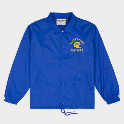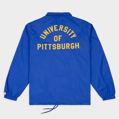 Through the late 1960s and '70s, football coaching staffs transitioned their sideline wardrobes from full suits and ties to light, workmen-style jackets; these coaches jackets were predecessors to the more spirited, uniformly branded looks we see on the sidelines today. Our take on a Pitt coaches jacket matches era-appropriate typefaces and logos with the structured collar and boxy fit of a vintage jacket. Made with durable-yet-lightweight nylon, and high-quality snap plackets and drawcords, it's the perfect outer layer for a brisk Pitt Football Saturday.