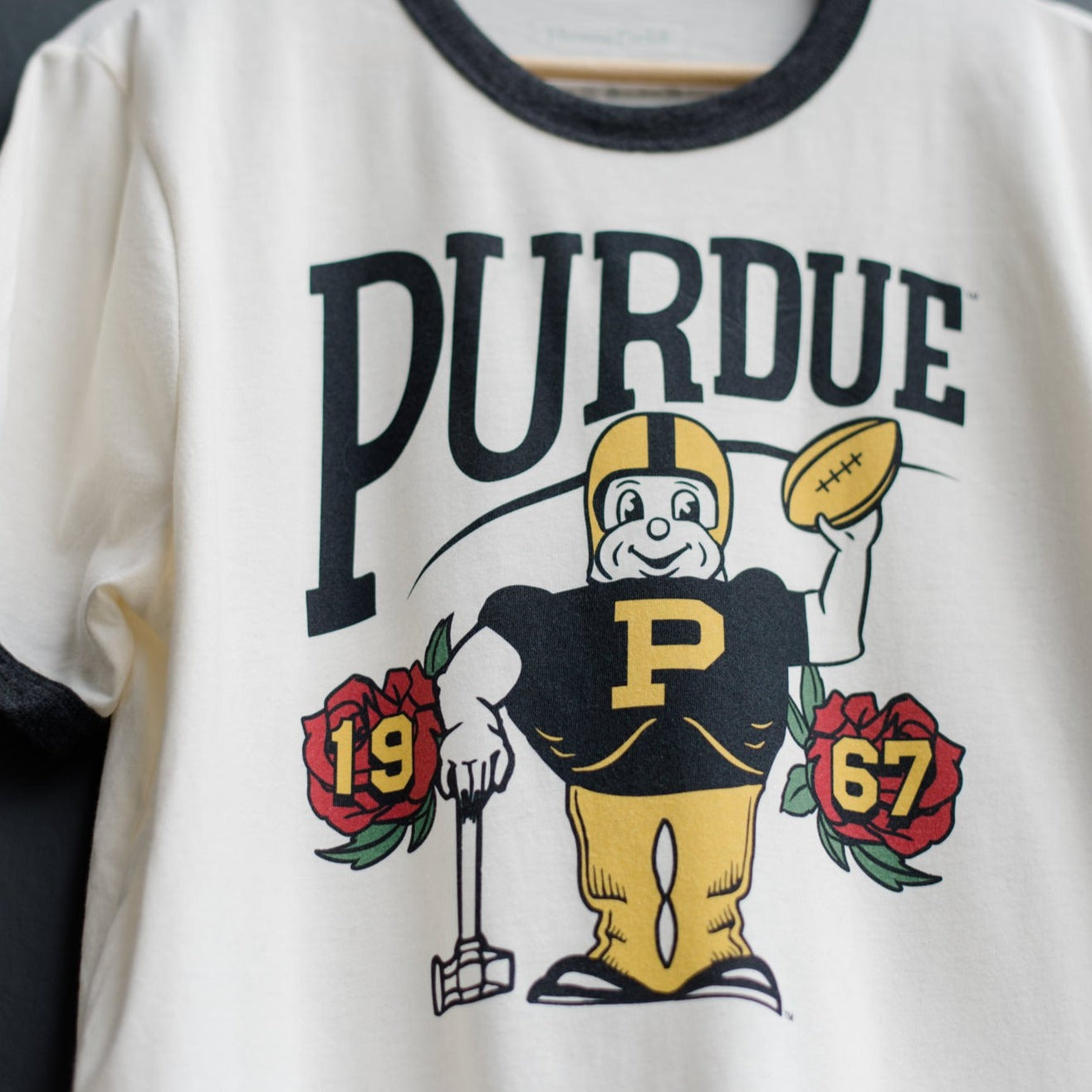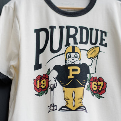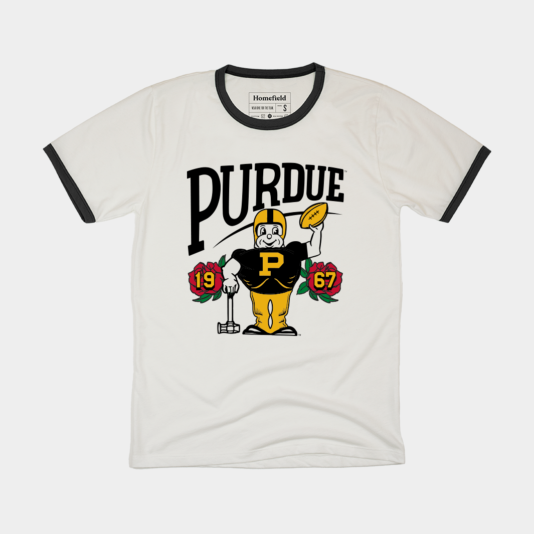 This vintage Purdue Pete design celebrates the Boilermakers’ Rose Bowl win in 1967. The seventh-ranked team in the nation, Purdue played a close game against USC. The Trojans didn’t convert on a two-point play after their second touchdown, cementing the Boilermaker victory in the team’s first trip to Pasadena.