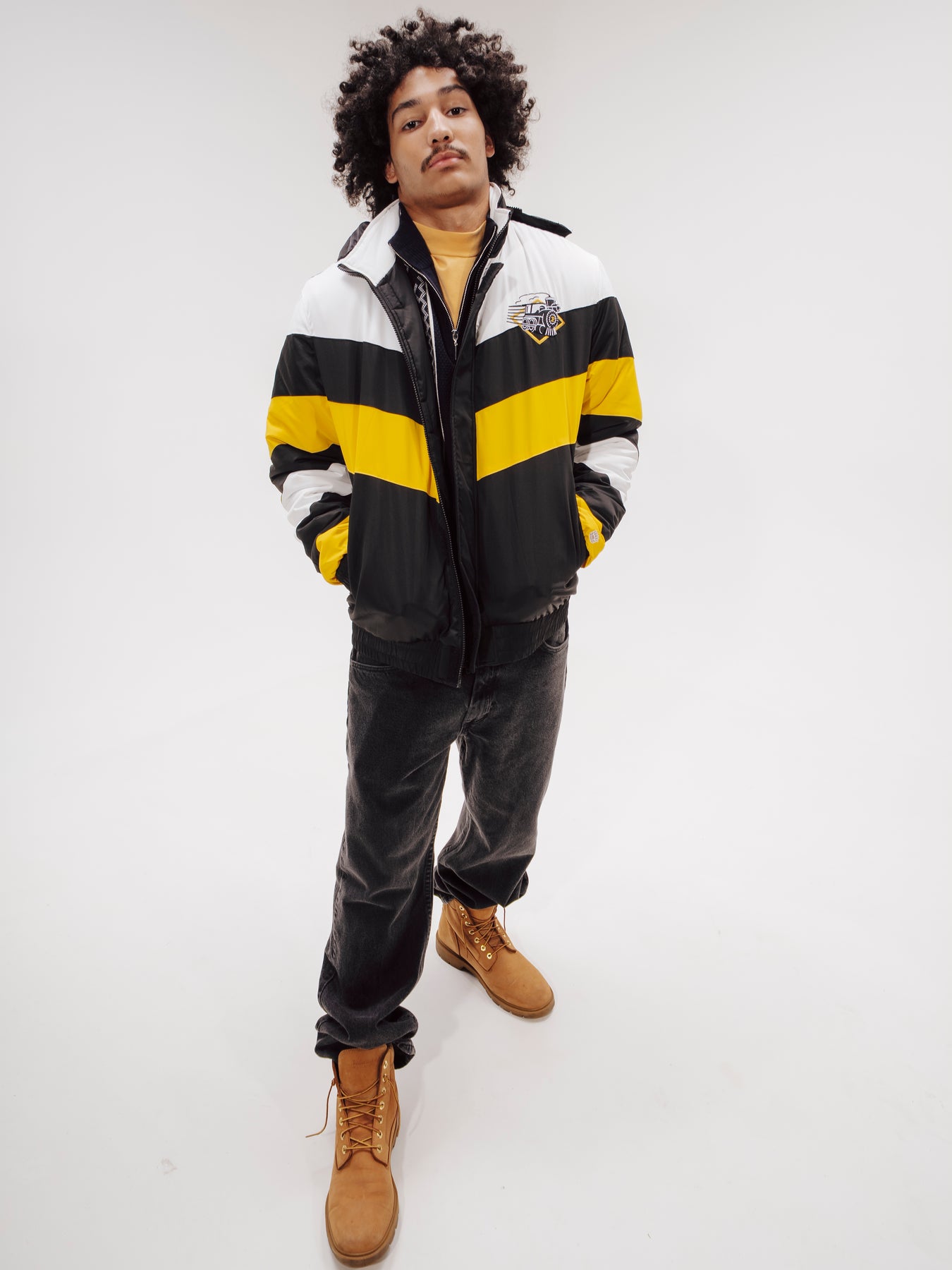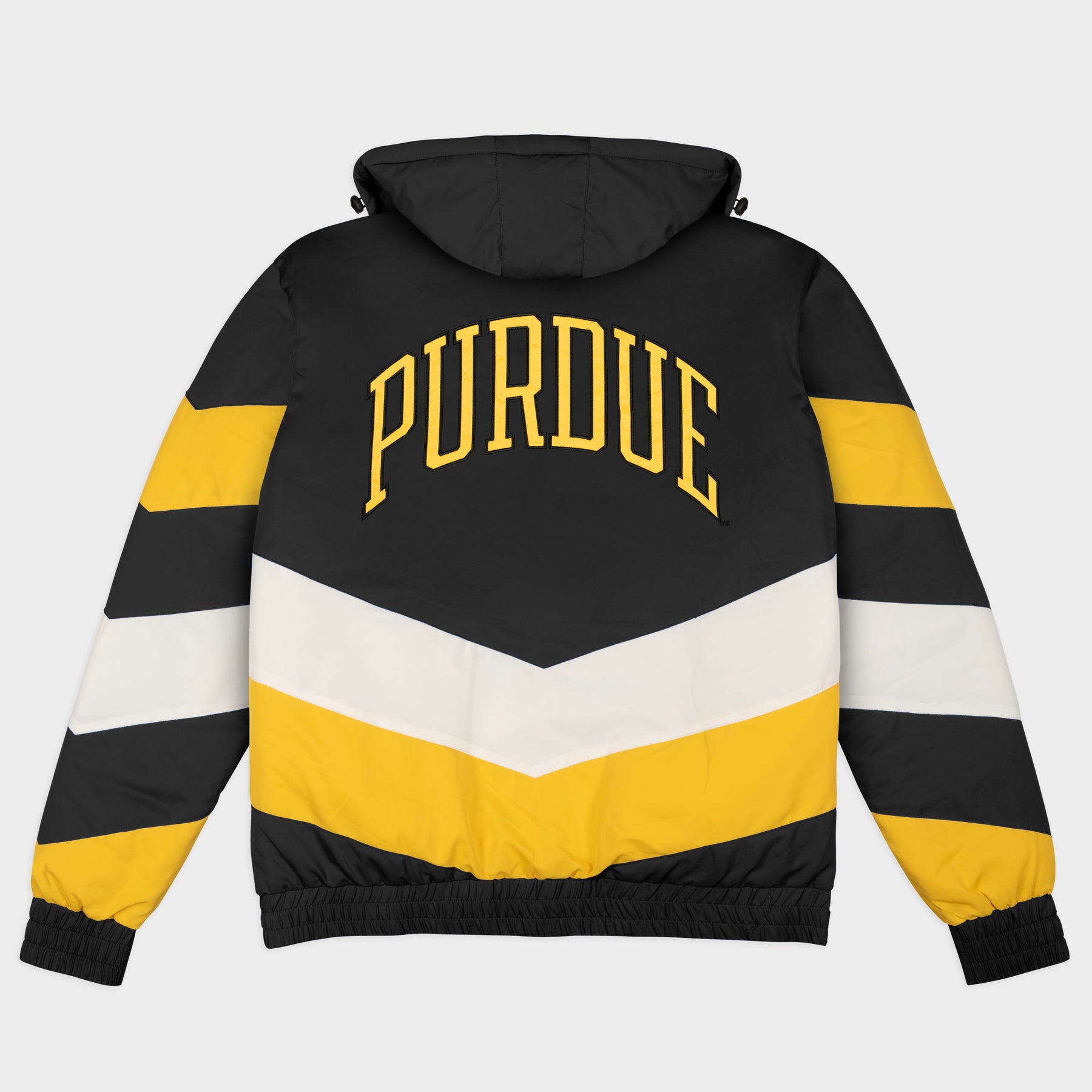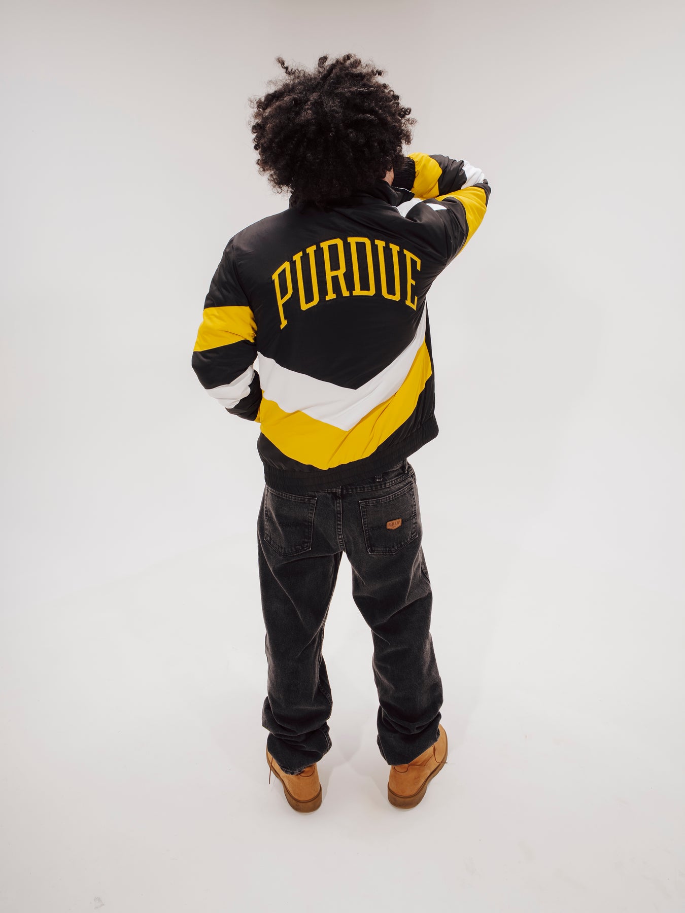 Change the winter jacket game with the Purdue Gamebreaker Jacket. Inspired by the bold, maximal sportstyle jackets of the 1990s, each jacket is designed with a high neck and removable hood to withstand whatever elements the day throws at you. The chevron stripes and classic, vintage logos on the chest and back paint the quintessential game day fashion picture.