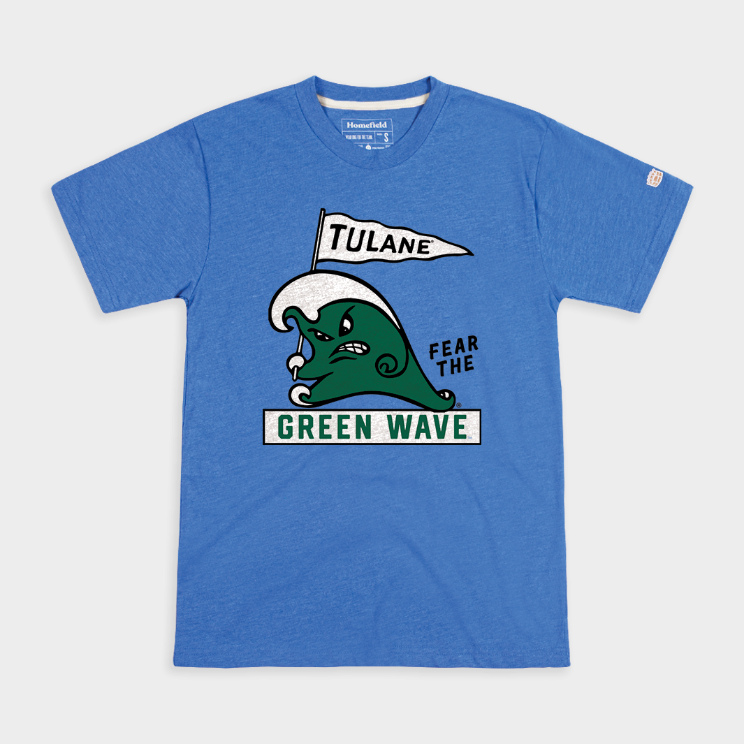 In 1963, Tulane's athletics director and bookstore manager jointly decided it was time to make a change in mascots, away from their original surfing Pelican. When they made the change, they hired none other than Angelus Pacific's Arthur Evans, considered the G.O.A.T. in mascot design-circles. He did not disappoint, coming up with Tulane's "Green Wave", printed here holding a pennant, on an incredibly comfortable light blue heather tee.