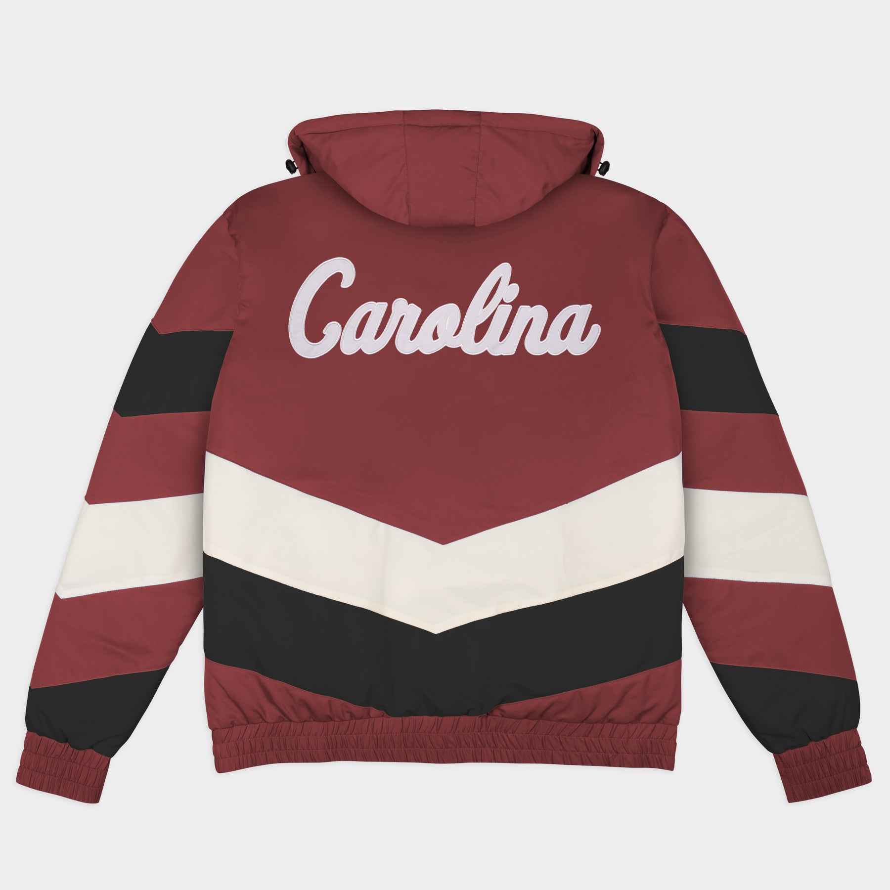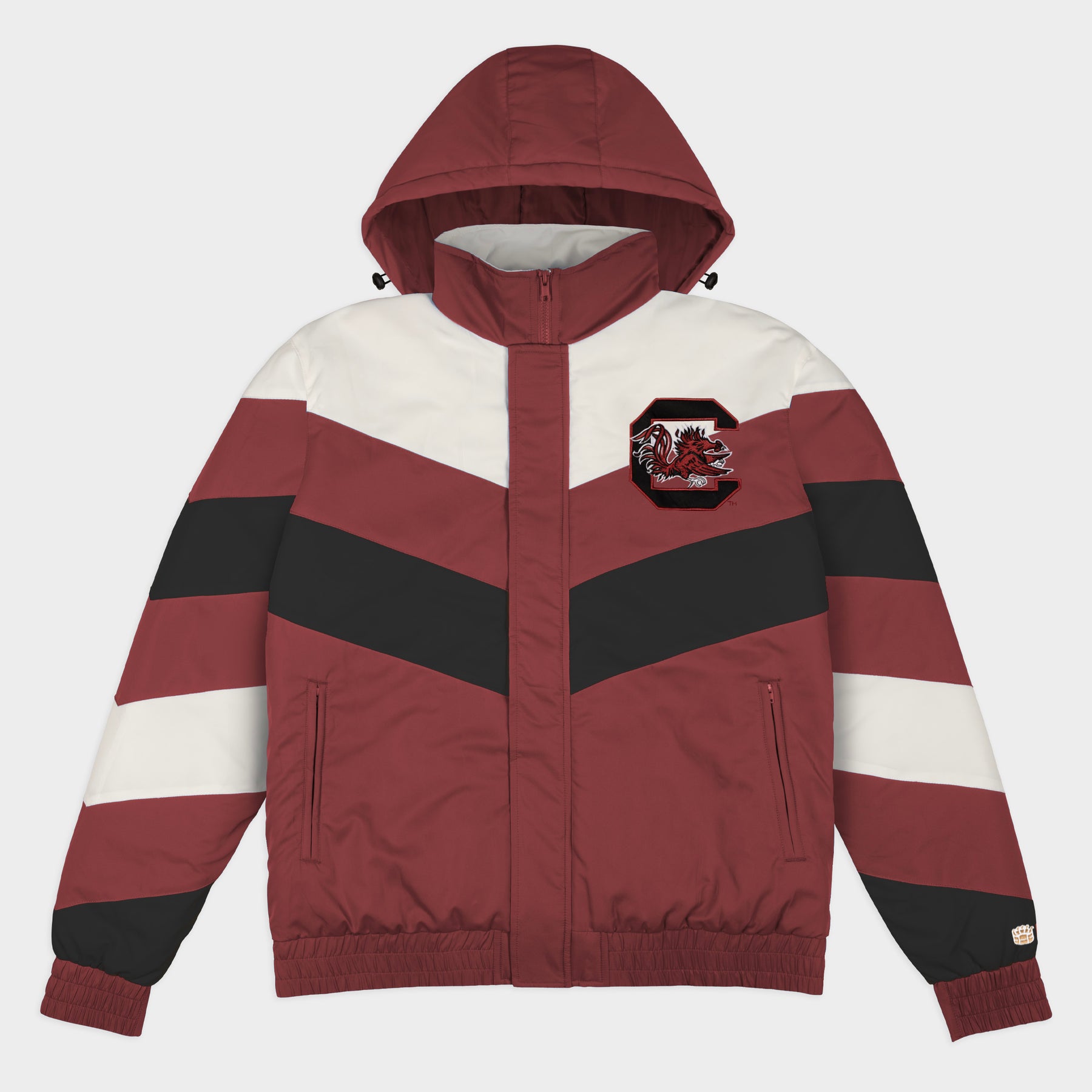 Change the winter jacket game with the South Carolina Gamebreaker Jacket. Inspired by the bold, maximal sportstyle jackets of the 1990s, each jacket is designed with a high neck and removable hood to withstand whatever elements the day throws at you. The chevron stripes and classic, vintage logos on the chest and back paint the quintessential game day fashion picture.