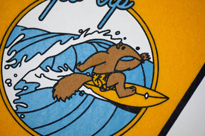 With UC Irvine only minutes away from the Southern California coast, it was only a matter of time until Peter the Anteater took up surfing. Here, he's riding the waves on an incredible felt pennant.