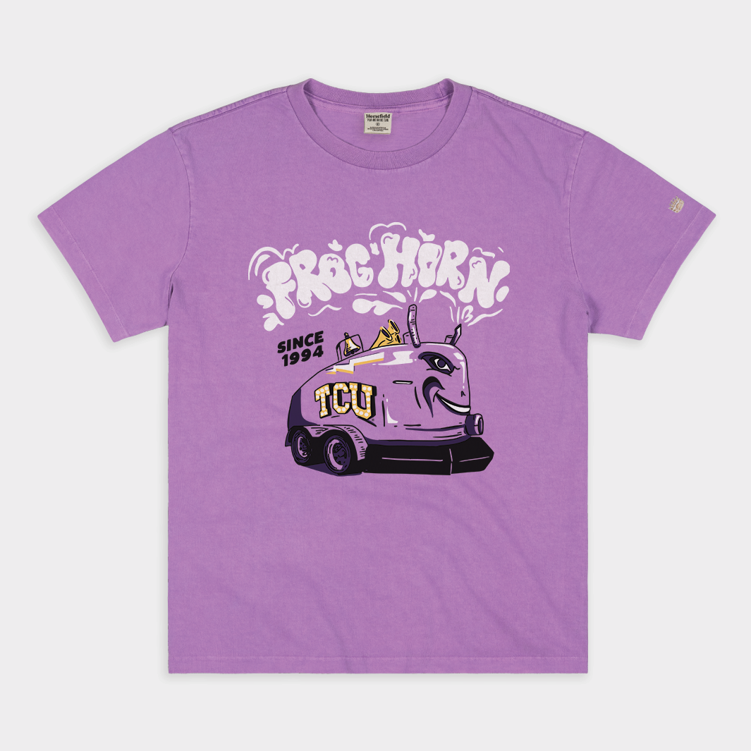Weighing a whopping 3,000 pounds and producing a sound that reaches 100 decibels 100 feet away, the Frog Horn is a staple of TCU football games. Who can imagine a Frogs touchdown without the accompanying smoke and shriek? We’ve commemorated this tradition with an original illustration. Products are mocked up on a size S. Graphics may appear smaller on larger sizes.