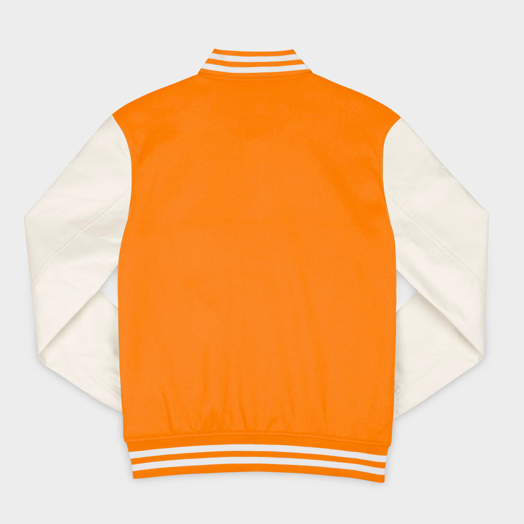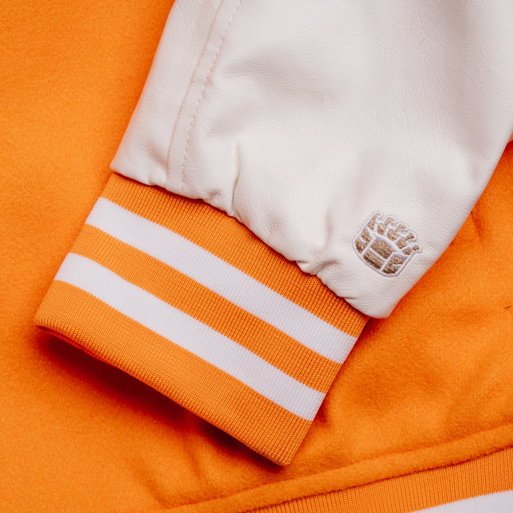 Our Sideline Jackets are inspired by varsity letter jackets. The vegan leather sleeves and chenille patch appliqué add timeless touches.