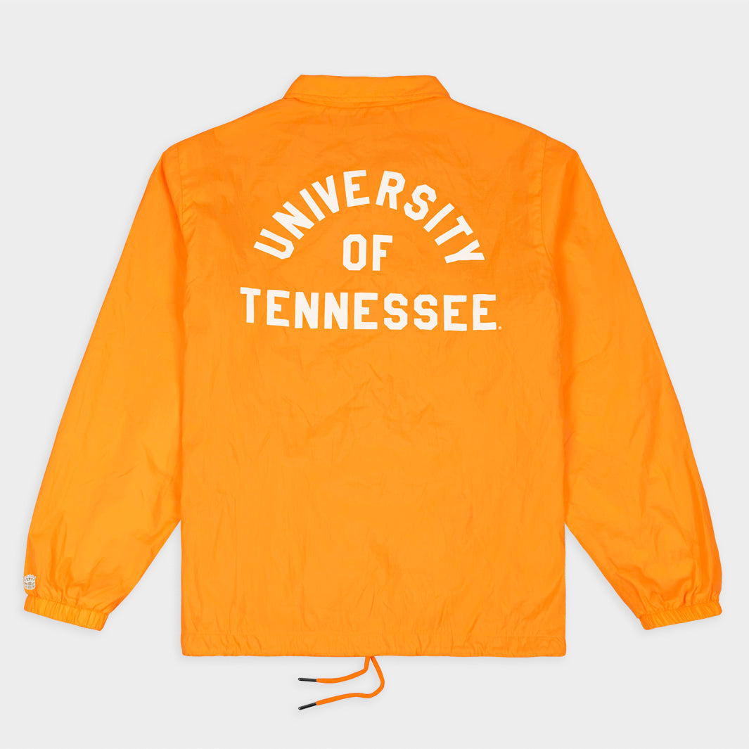 Through the late 1960s and '70s, football coaching staffs transitioned their sideline wardrobes from full suits and ties to light, workmen-style jackets; these coaches jackets were predecessors to the more spirited, uniformly branded looks we see on the sidelines today. Our take on a Tennessee coaches jacket matches era-appropriate typefaces and logos with the structured collar and boxy fit of a vintage jacket. Made with durable-yet-lightweight nylon, and high-quality snap plackets and drawcords, it's the perfect outer layer for a brisk Football Saturday in Knoxville.