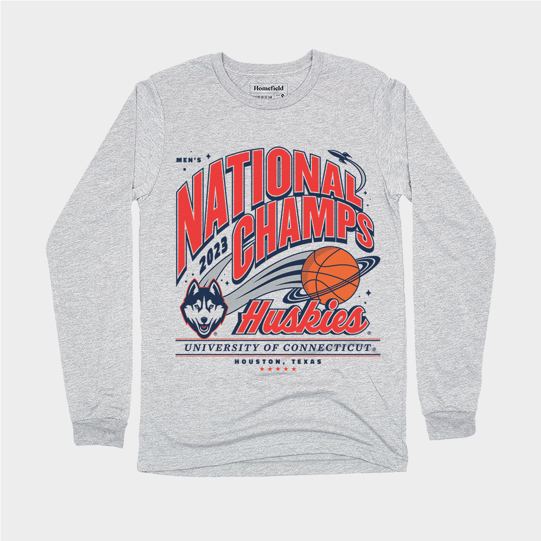 UConn shot for the moon in Houston, and their men's tournament win is nothing short of interstellar. This '90s-inspired design features the modern Jonathan logo, five stars for five titles, and some out-of-this world elements to let everyone know UConn means business.