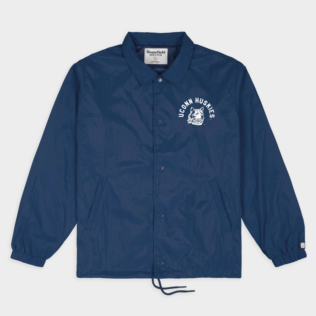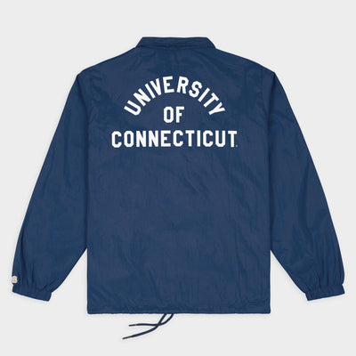 Through the late 1960s and '70s, football coaching staffs transitioned their sideline wardrobes from full suits and ties to light, workmen-style jackets; these coaches jackets were predecessors to the more spirited, uniformly branded looks we see on the sidelines today. Our take on a UConn coaches jacket matches era-appropriate typefaces and logos with the structured collar and boxy fit of a vintage jacket. Made with durable-yet-lightweight nylon, and high-quality snap plackets and drawcords, it's the perfect outer layer for a brisk Football Saturday in East Hartford.