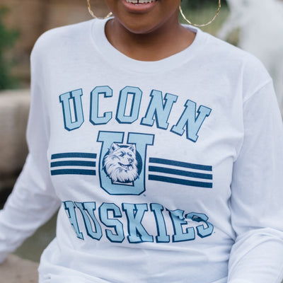 Products are mocked up on a size S. Graphics may appear smaller on larger sizes. UCONN-LONG-002-XS-CLCVTGOur unisex tees run true to size. If you're looking for a roomier fit, we suggest sizing up!
