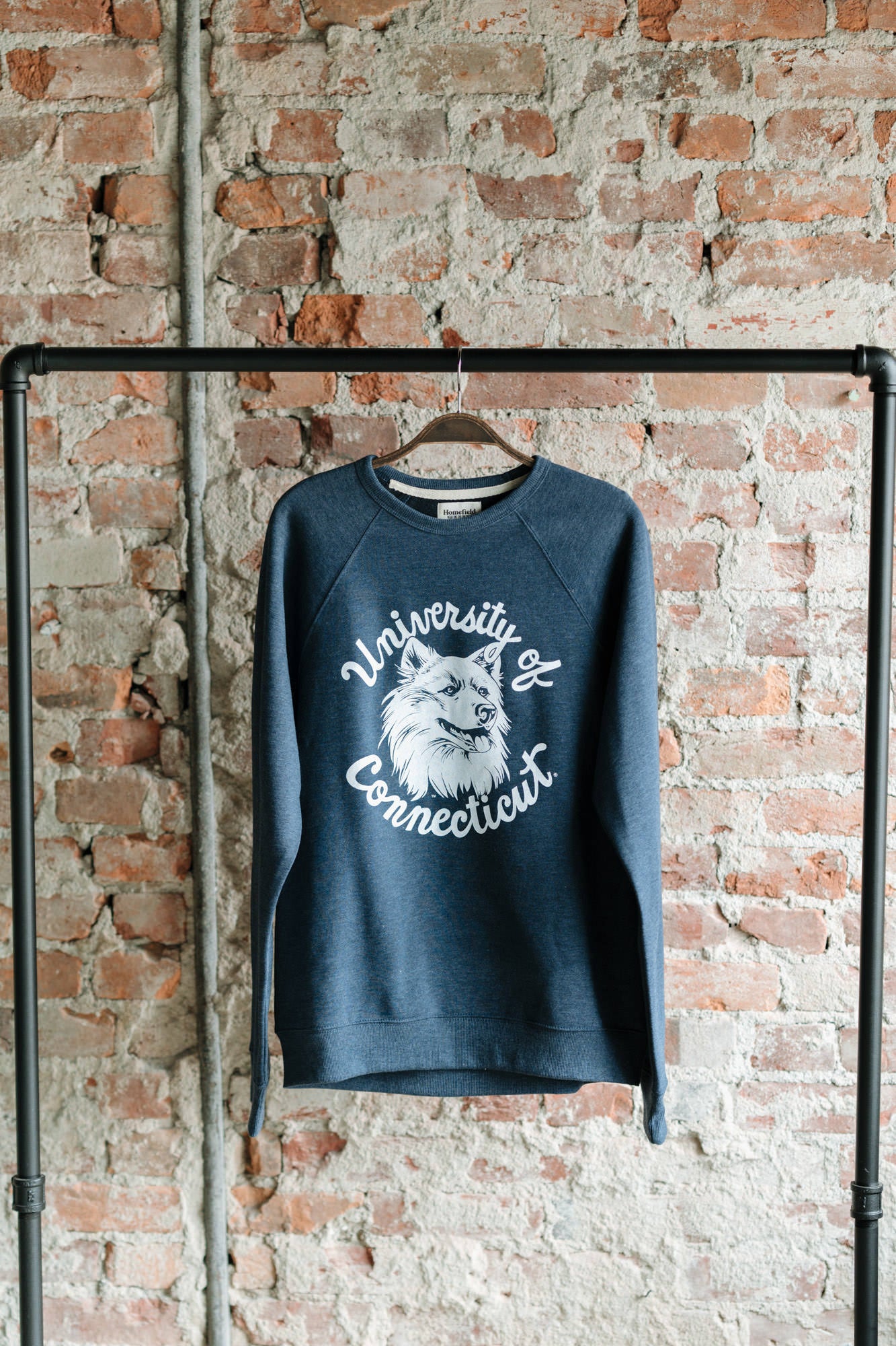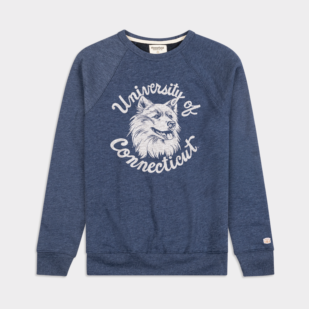 The “sad dog” only lasted one year as UConn’s logo, soon being replaced by more jovial versions of the husky. This particularly proud version was UConn’s athletic mascot in the 1980’s and 1990’s. We found him and this script on the bell covers of the marching band’s sousaphones back in 1988.