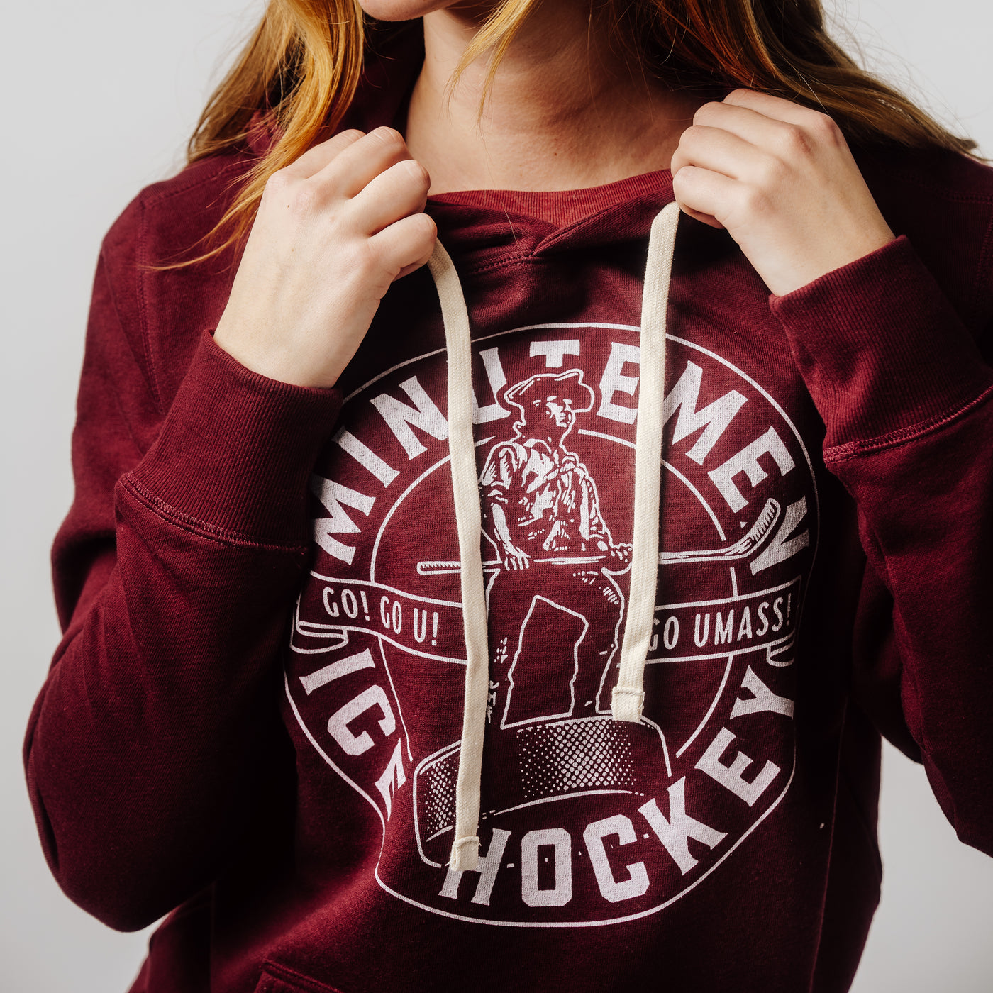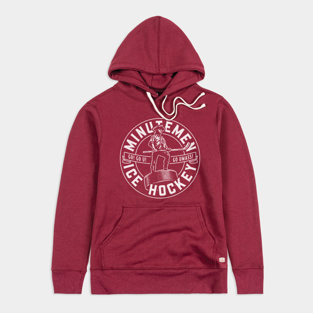 In this retro-inspired design, the iconic UMass Minuteman has traded in his musket for a hockey stick to celebrate UMass hockey. The school first embraced hockey in the 1908-09 season, when they actually played on UMass’ campus pond; without a proper home, the team only played sporadically whenever the pond’s ice was usable. This unsustainable strategy briefly collapsed the Minutemen hockey program until 1993, when the Mullins Center opened. Having proper facilities paid dividends, as UMass attracted future NHLers and made their first NCAA tournament in 2007.