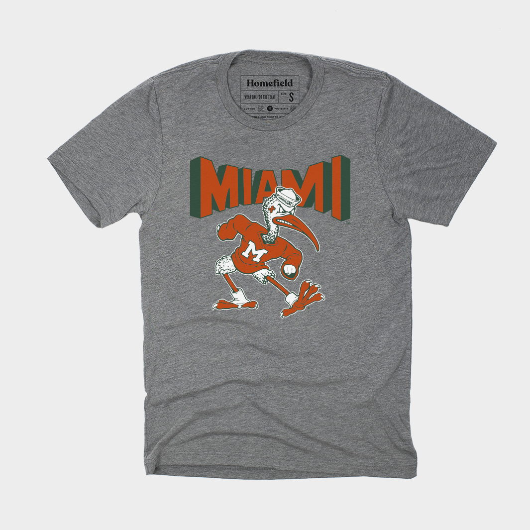 The ‘Canes proudly wear the colors orange, green, and white with honor, but many may not be familiar with when and how the colors were selected. In 1926, the colors were chosen to represent the Florida orange tree. Orange symbolizes the fruit of the tree, green represents the leaves, and white the blossoms. Those colors paired with this version of Sebastian the Ibis make for a great-looking t-shirt.