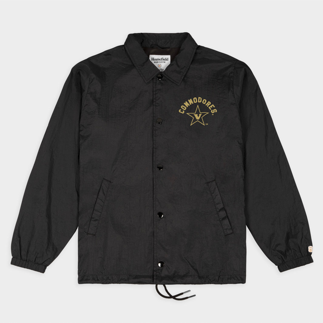 Through the late 1960s and '70s, football coaching staffs transitioned their sideline wardrobes from full suits and ties to light, workmen-style jackets; these coaches jackets were predecessors to the more spirited, uniformly branded looks we see on the sidelines today. Our take on a Vanderbilt coaches jacket matches era-appropriate typefaces and logos with the structured collar and boxy fit of a vintage jacket. Made with durable-yet-lightweight nylon, and high-quality snap plackets and drawcords, it's the perfect outer layer for your Vandy game day 'fit.