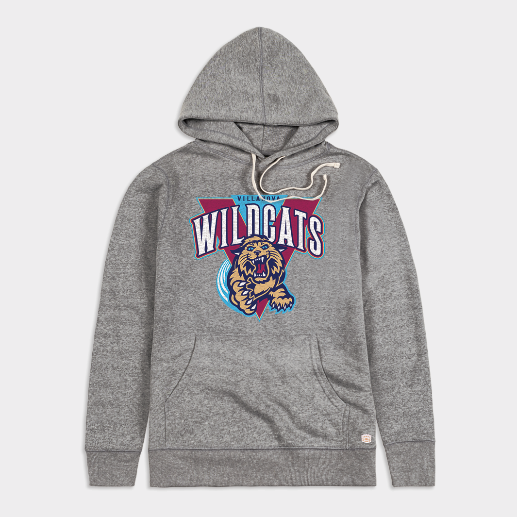 The Villanova V behind a lunging wildcat is one of the most memorable collegiate logos of the 1990s. Lasting just into the early 2000s, it introduced new colors to the Villanova palette and was popularized by the basketball team wearing a version on their shorts in the Kerry Kittles years. Celebrate Villanova logo history in one of the comfiest hoodies you’ll ever wear.