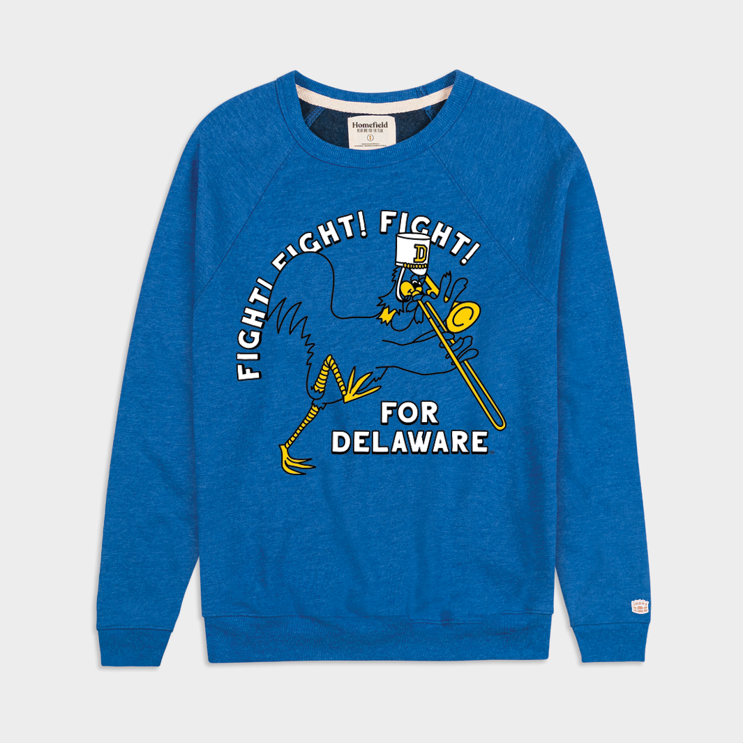 This Dr. Suess-esque marching hen comes from the cover of the Delaware v. Akron 1973 football program. It was Band Day, so it's only appropriate. Products are mocked up on a size S. Graphics may appear smaller on larger sizes. DEL-CREW-003-XS
