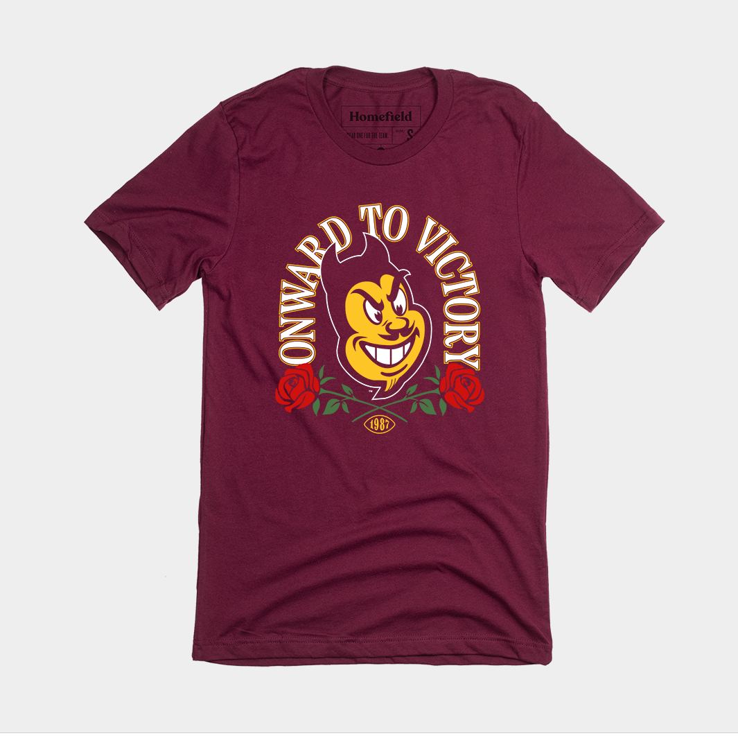 On January 1, 1987, the Arizona State Sun Devils beat the Michigan Wolverines 22-15 to win the Rose Bowl. Celebrate the victory with this beautiful maroon tee.