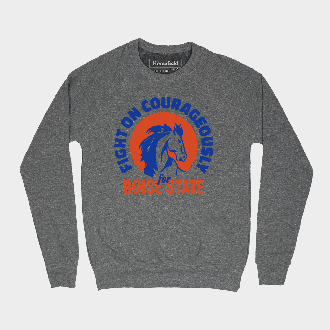 A noble bronco with a flowing mane was featured on the Boise State football helmets in the 1972 and 1973 seasons, with the 1973 team bringing home their first of six Big Sky Conference championships. We paired that historic Bronco logo with our favorite line from the Boise State fight song for this comfortable crewneck design.