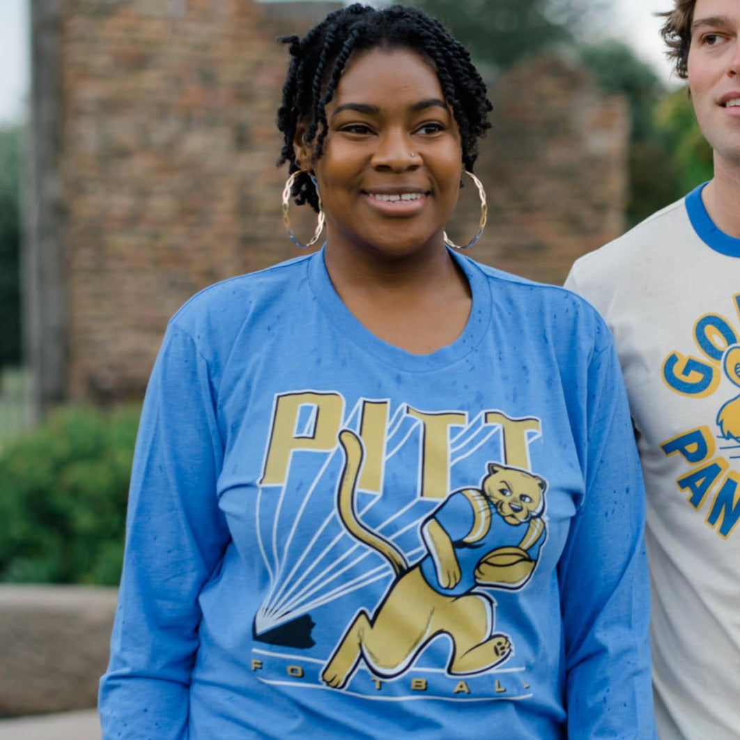 This vintage-inspired design celebrates Pitt football and the city the university calls home. You’ll find ROC on the gridiron alongside the Panthers at the heart of the Three Rivers at Acrisure Stadium (formerly and famously known as Heinz Field). Brought to you in partnership with College Vault.