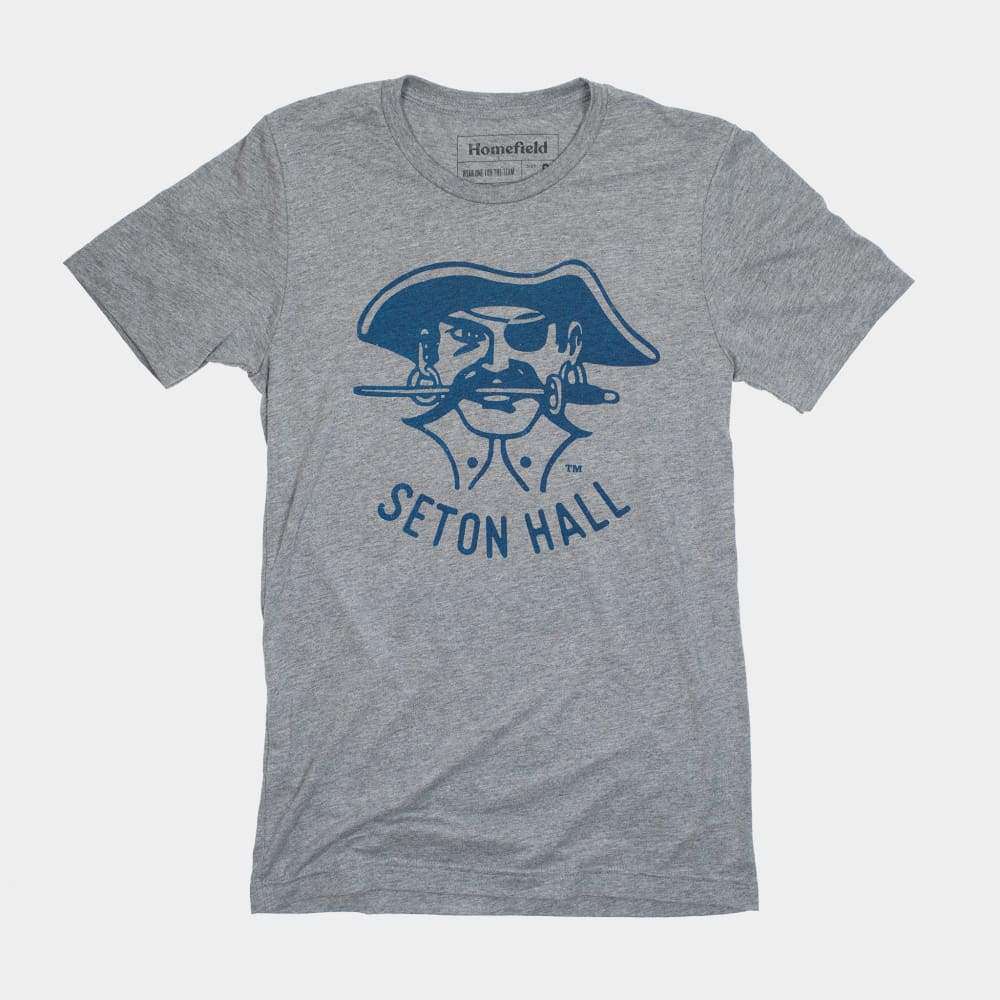 Seton Hall has had a variety of Pirate mascots throughout the history, and this one ranks right near the top. Printed on an incredibly comfortable grey tee.