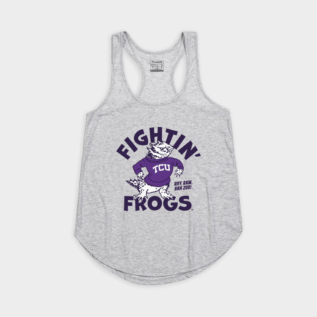 A critter common in the Southwest and on TCU’s campus, the horned frog first appeared on the cover of the school yearbook in 1897. The football team quickly adopted it as their mascot, and the name stuck. One of the most unique cheers in college sports came around just a few decades later and its words still ring out on campus today: Riff, Ram, Bah Zoo! Enjoy two elements of TCU history brought together for you today on this flowy women’s tank.