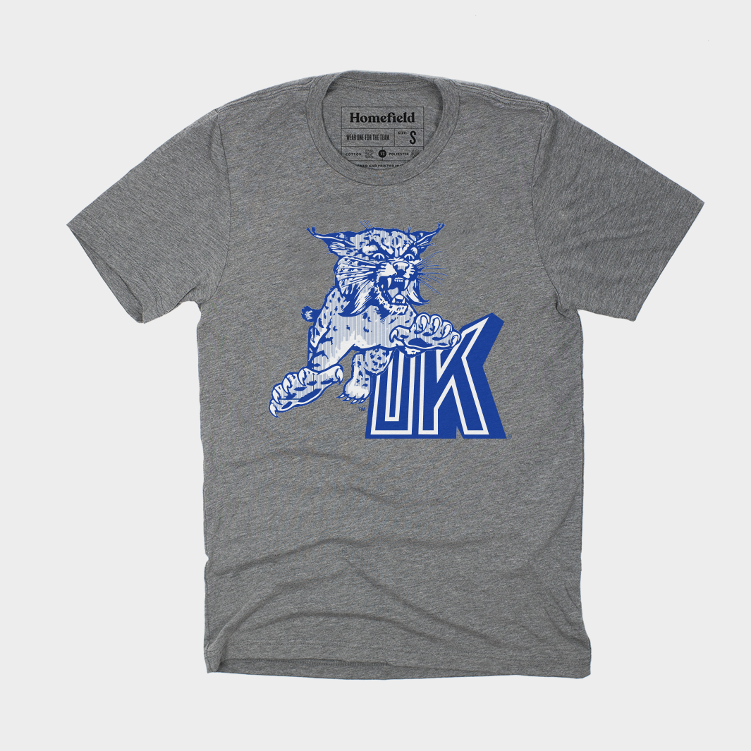 After a hard-fought 6-2 football game victory on the road against Illinois in 1909, Commandant Philip W. Corbusier, head of the school’s military department at that time, told a group of students that he thought the team “fought like wildcats.” As the name became more popular with students and sportswriters, the university officially adopted the nickname. The UK Wildcats design we printed on this comfortable t-shirt came from a vintage decal estimated to be from the 1960s.