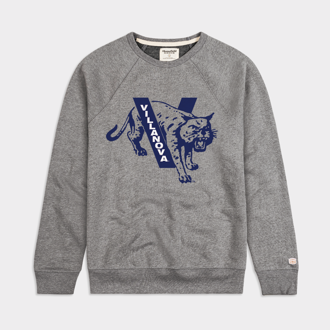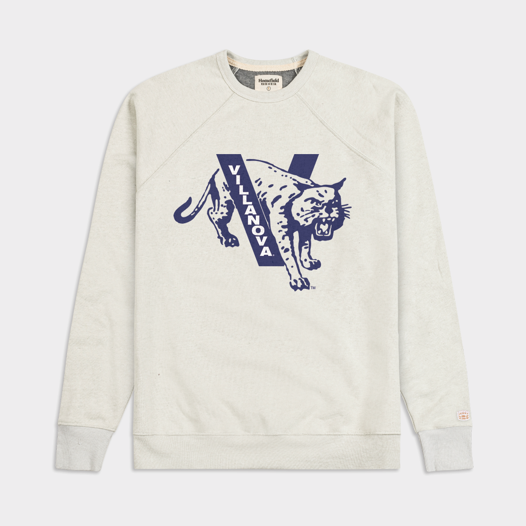 In use from 1965-1995, this iconic Villanova logo is still beloved by fans. The university adopted the nickname “Wildcats” after a student body vote in 1926. While “wildcat” is a fairly broad term, Villanova’s mascot most closely resembles a bobcat. We’ve printed this legendary Wildcat mark on our super soft light grey crew!