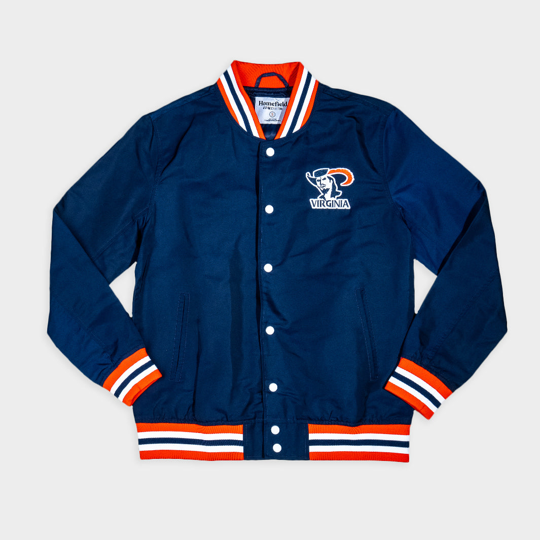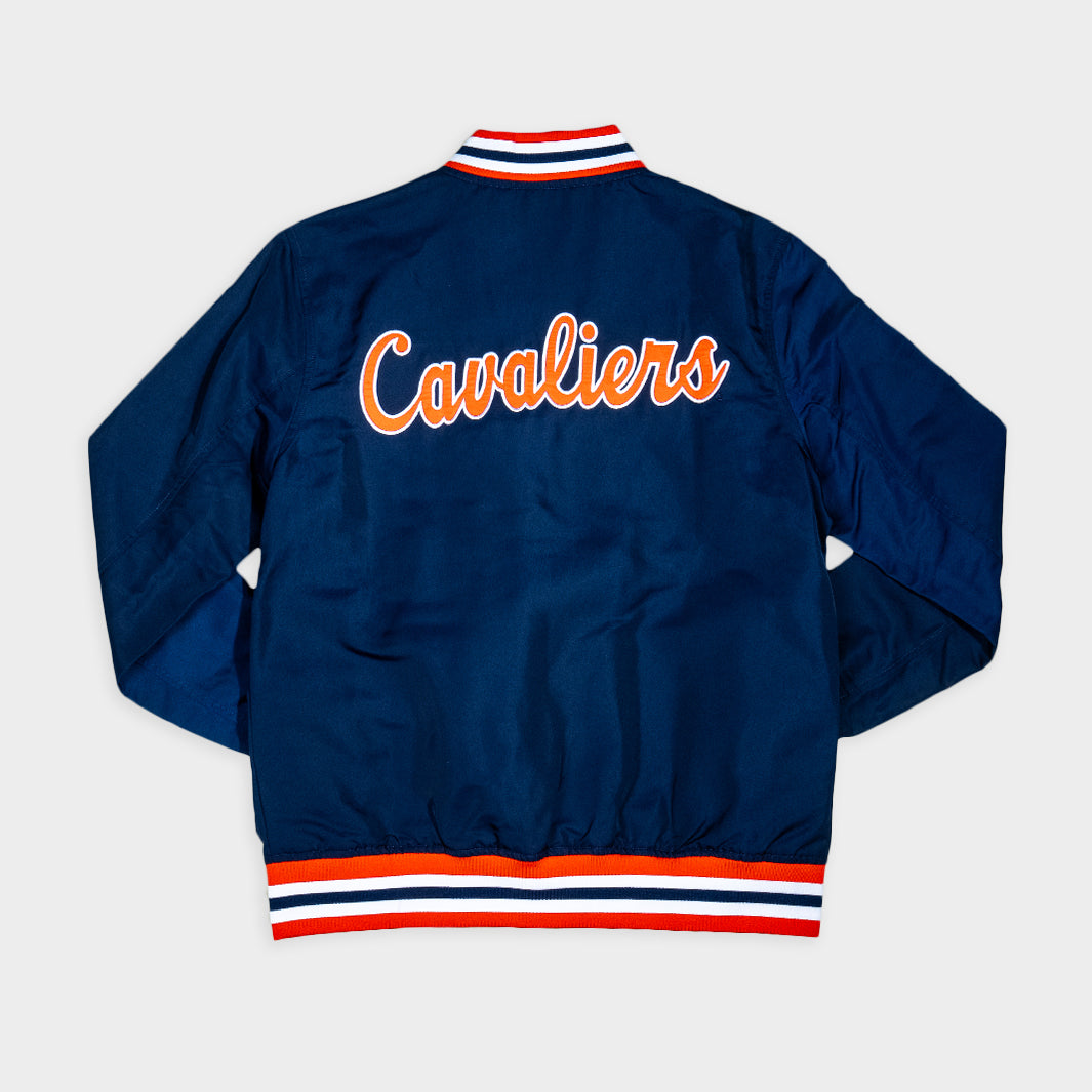 This Cavalier logo was used from 1984-1994; local designers Jim Gibson and Charles Peale brought this interpretation of Virginia's mascot to life. Paired with a beloved Cavaliers script, this bomber jacket tips its feathered cap to the Hoos.