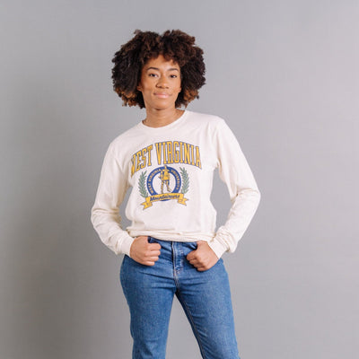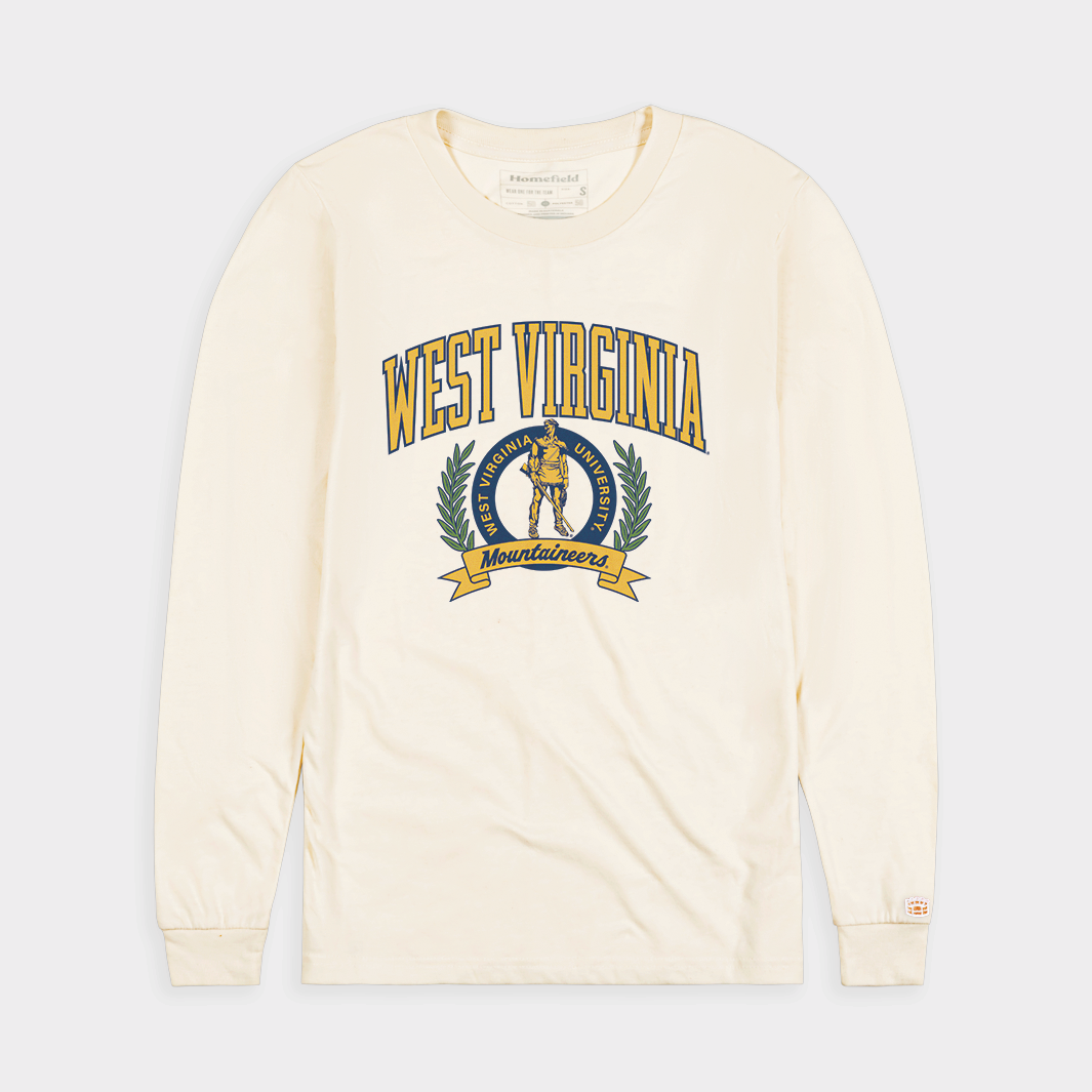 This design, partially inspired by retro college apparel and university crests, features an illustration of sculptor Donald De Lue's 1971 bronze statue “The Mountaineer” that stands proudly on the front lawn of the Mountainlair student union building. Brought to you in partnership with College Vault.