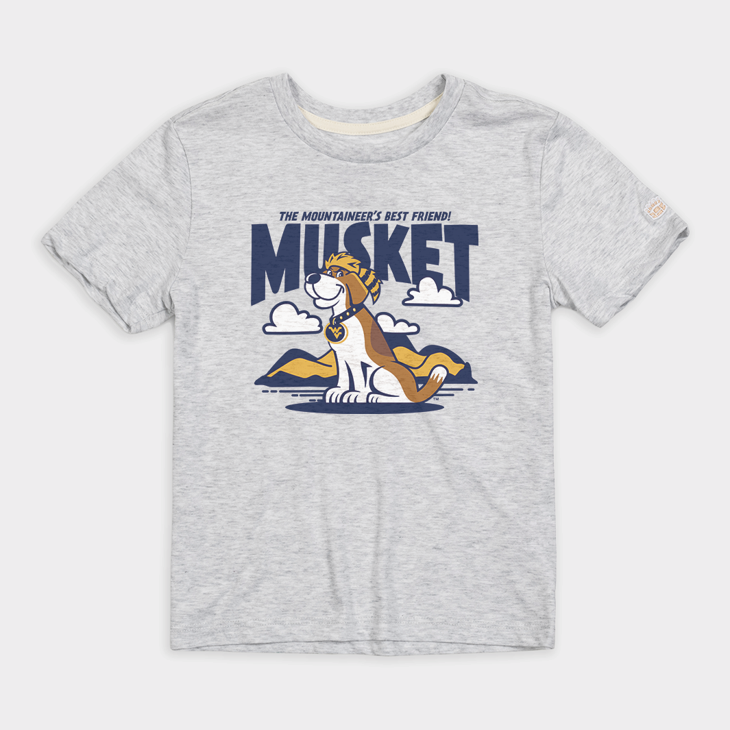 Debuting in 2012 as “the official friend of the Mountaineer,” Musket the dog is a companion to WVU’s beloved mascot. Prior to making his Homefield tee debut, Musket has brought joy to the littlest Mountaineers via two books, “Let’s Go Mountaineers!” and “Musket’s Big Adventure,” and as a plush toy. We’re also told he loves belly rubs.