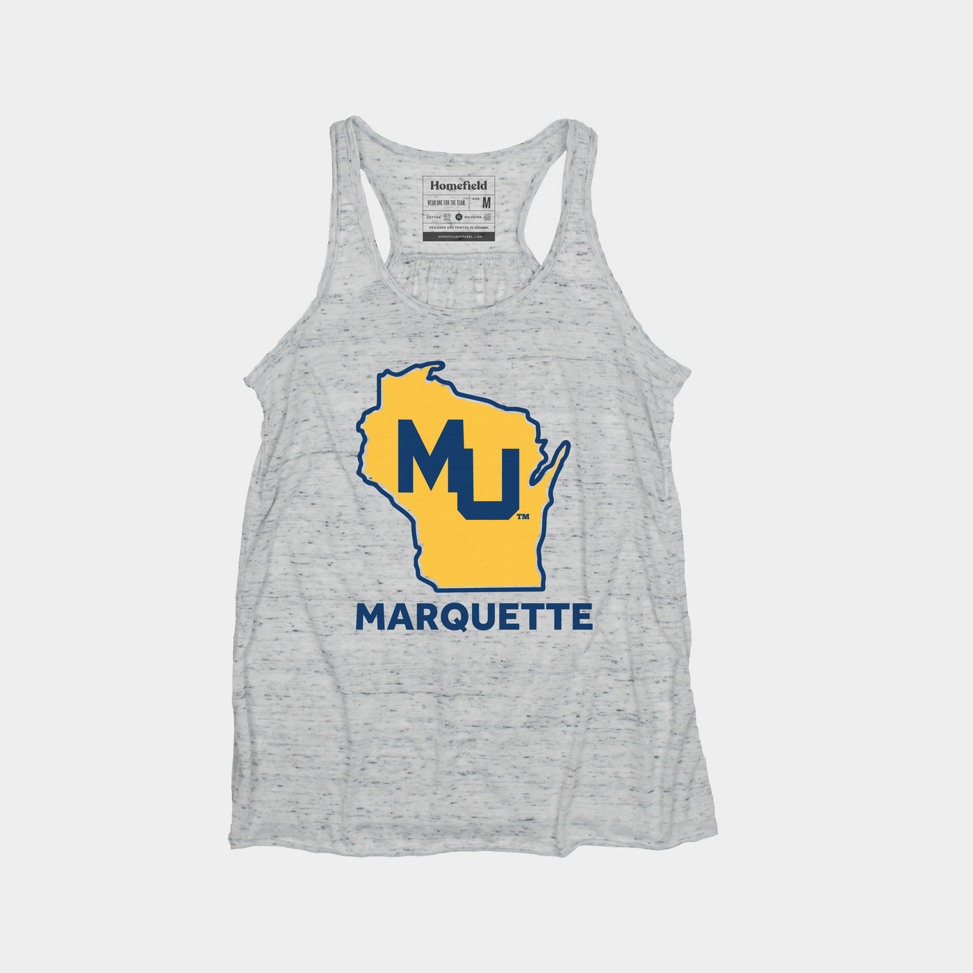 Marquette has brought the state of Wisconsin their only basketball national championship in 1977. This design is a nod to that title, with the vintage MU logo from the 70s across the state. Printed on an incredibly women's racerback flowy tank.